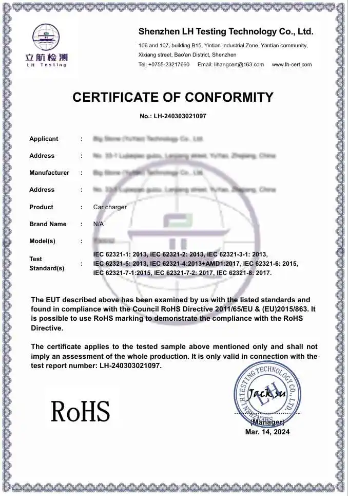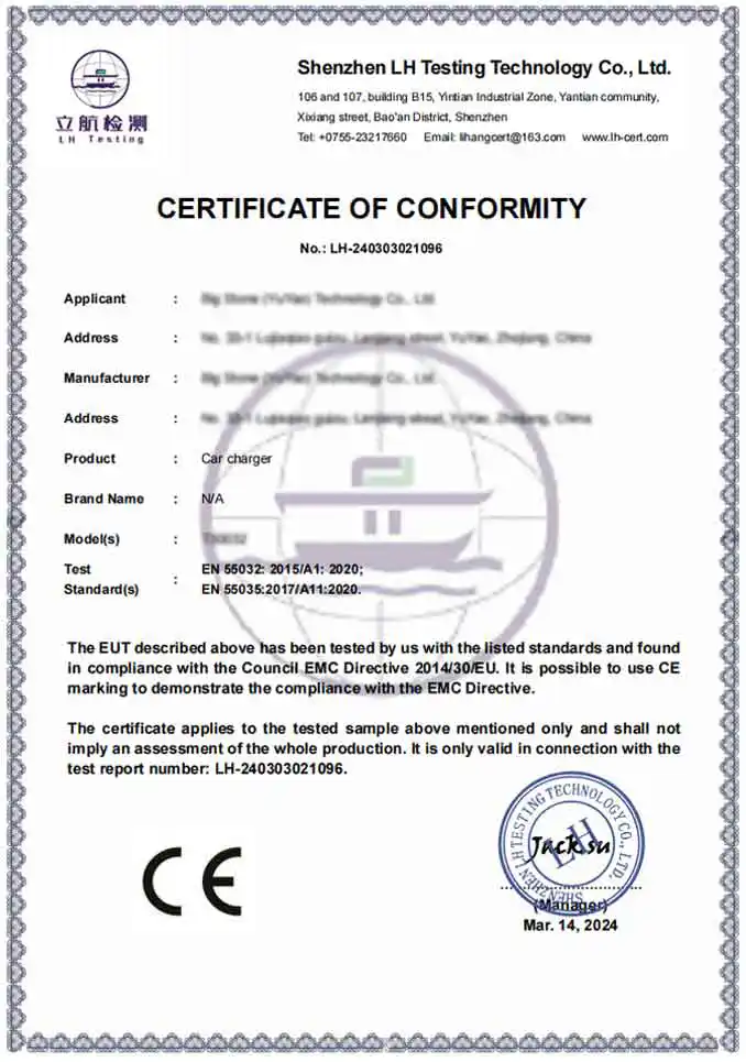 Odp.: Jako profesjonalna fabryka nasze produkty są w pełni zgodne z międzynarodowymi normami bezpieczeństwa i ochrony środowiska. Dostarczamy produkty posiadające certyfikaty CE i RoHS. Co więcej, nasz zakład produkcyjny posiada certyfikaty BSCI i ISO, co gwarantuje, że nasze adaptery do ładowarek samochodowych spełniają rygorystyczne standardy techniczne i etyczne wymagane przez światowe marki premium.