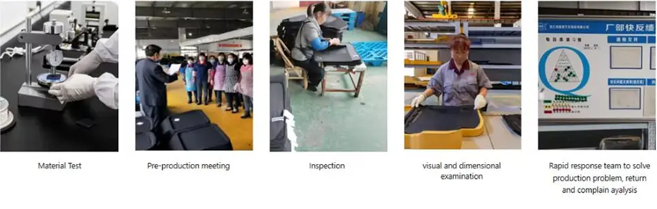Jesteśmy w pełni zgodni z normami ISO9001 w zakresie projektowania i produkcji dywaników samochodowych, ISO/TSI16949 w zakresie kontroli jakości, ISO14001:2015 w zakresie zarządzania środowiskowego, BSCI w zakresie odpowiedzialności społecznej oraz normy UE REACH dotyczące surowców. Posiadamy własne urządzenia testujące, które umożliwiają samokontrolę, aby upewnić się, że nasze produkty przechodzą testy przeprowadzane przez SGS, Intertek lub dowolnego innego zewnętrznego inspektora, jakiego mogą wymagać klienci.