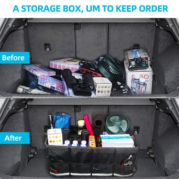 W trzech głównych przegrodach mieszczą się narzędzia, żywność, sprzęt sportowy, środki czyszczące i artykuły ratunkowe. Cztery boczne kieszenie z siateczki pomieszczą drobne rzeczy, takie jak ręczniki czy karty. Kieszeń z przednią klapką zabezpiecza drobiazgi. Pasuje do ciężarówek, sedanów, SUV-ów, samochodów dostawczych i prawie każdego pojazdu.