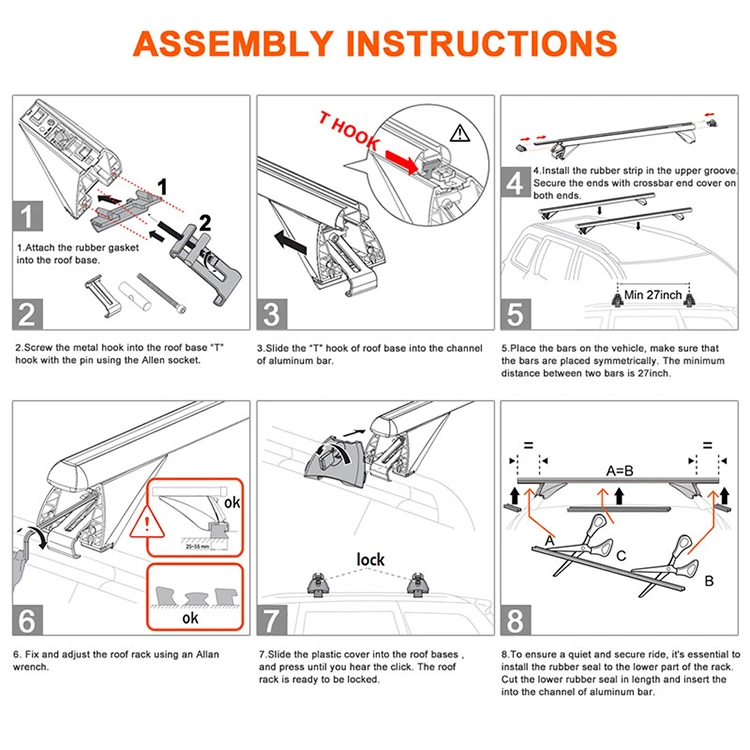 Montaż tych poprzeczek do bagażnika dachowego jest łatwy: w zestawie klucz sześciokątny umożliwiający konfigurację na 10 minut; instrukcja z ilustracjami krok po kroku.